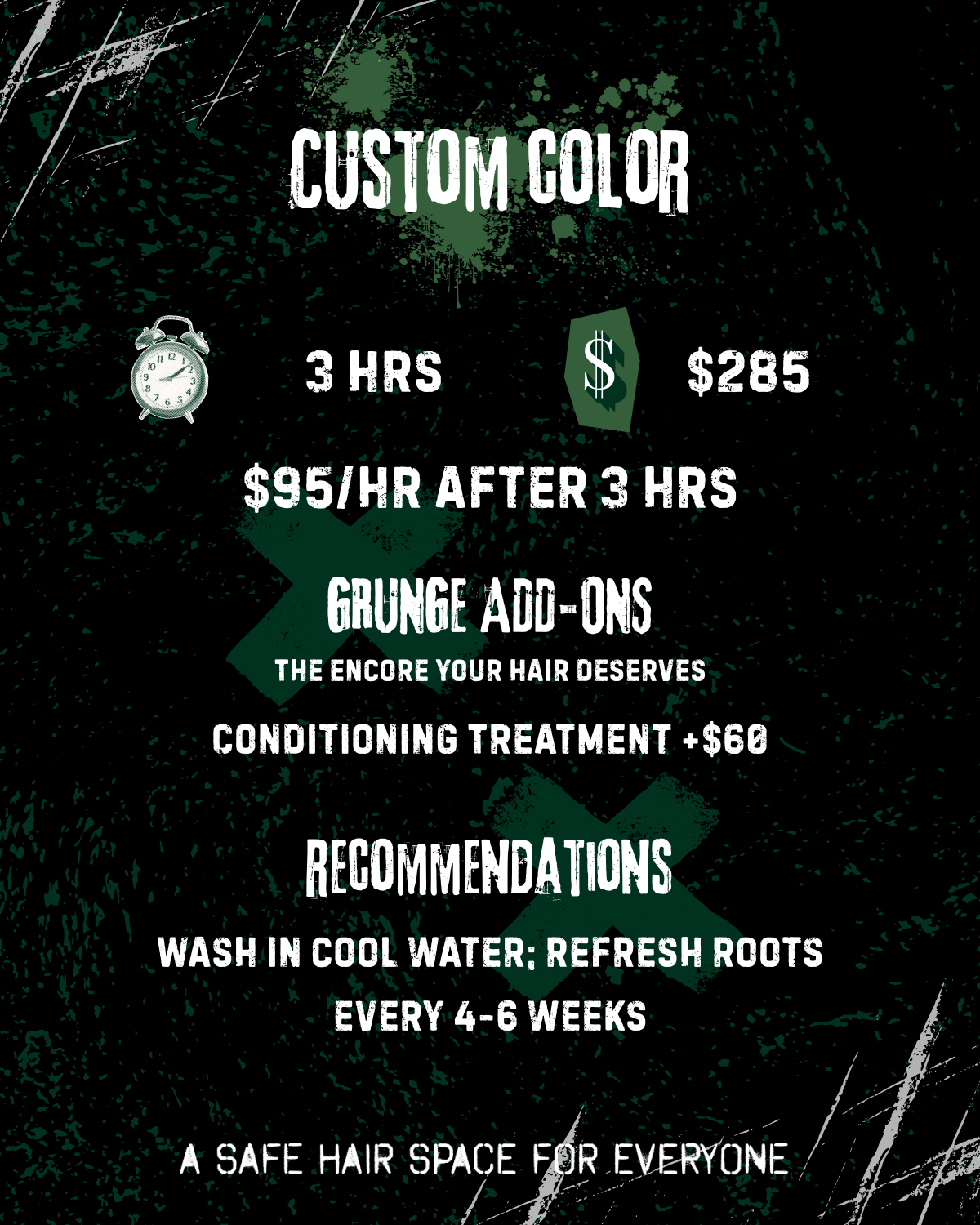 The results of a Custom Color can vary based on your initial hair condition and color goals. Expect a dramatic transformation if you're transitioning from a dark to a lighter shade or correcting uneven tones. Pricing for this service ranges from $285 to $475, accommodating different levels of complexity in the color correction process (hourly rate of $95 per hour).